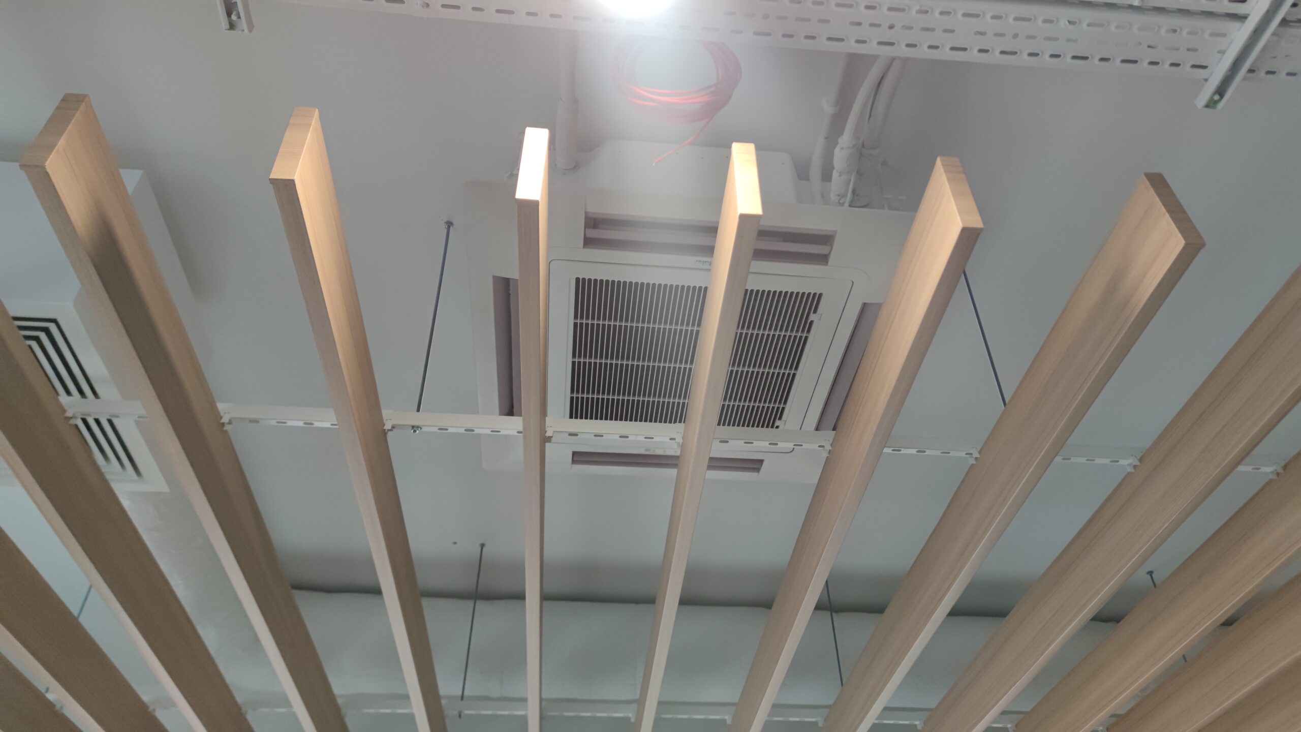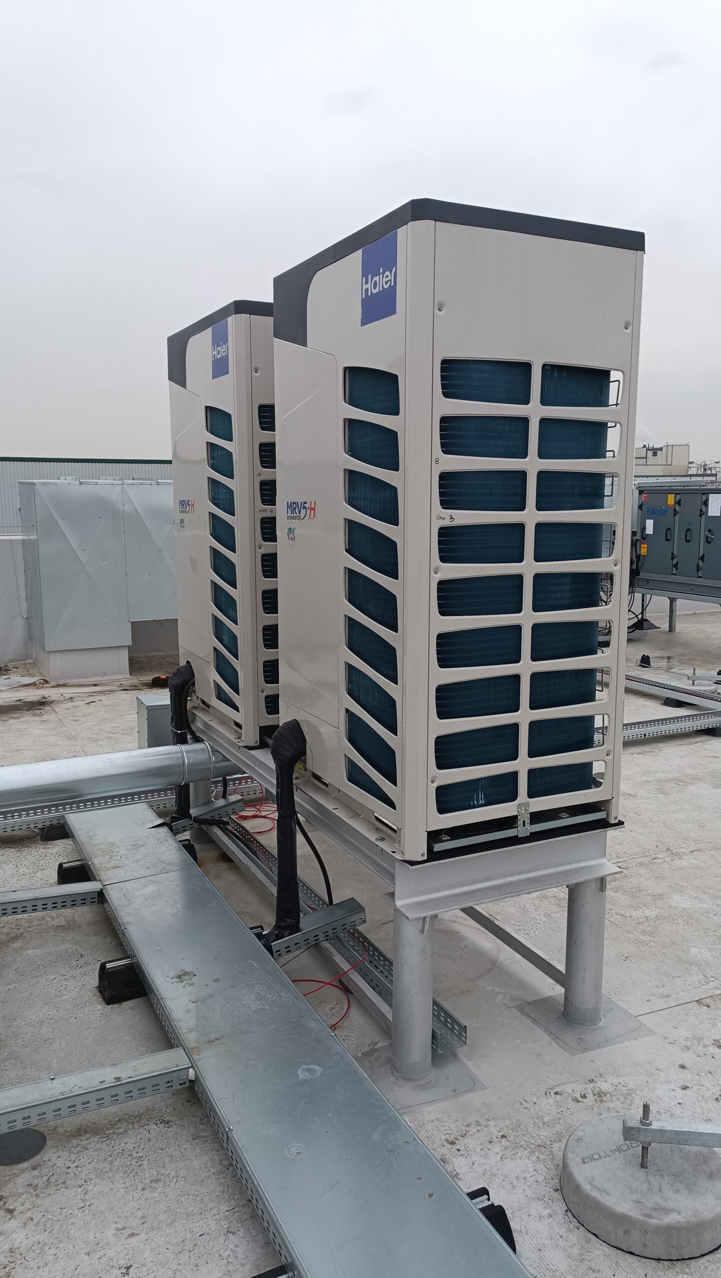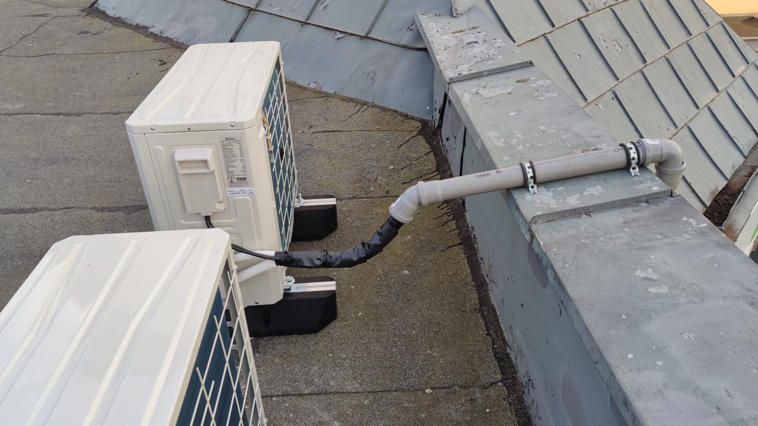 Wybór tych konkretnych modeli podyktowany był ich energooszczędnością, niezawodnością oraz wysoką kulturą pracy (cicha praca urządzeń). Obie jednostki wewnętrzne zostały rozmieszczone dyskretnie w przestrzeniach przysufitowych, co pozwala zachować ergonomię i estetykę wnętrz, jednocześnie zapewniając równomierne rozprowadzenie powietrza. Jednostki zewnętrzne wyprowadzono na dach budynku, gdzie zostały stabilnie osadzone na wspornikach kauczukowych, minimalizujących wibracje i hałas. Dzięki takiemu montażowi nie ingerowano w przestrzenie użytkowe obiektu i zachowano pełną funkcjonalność budynku.