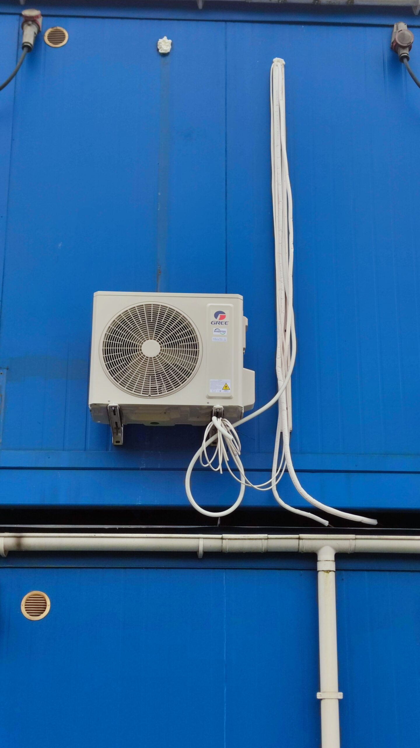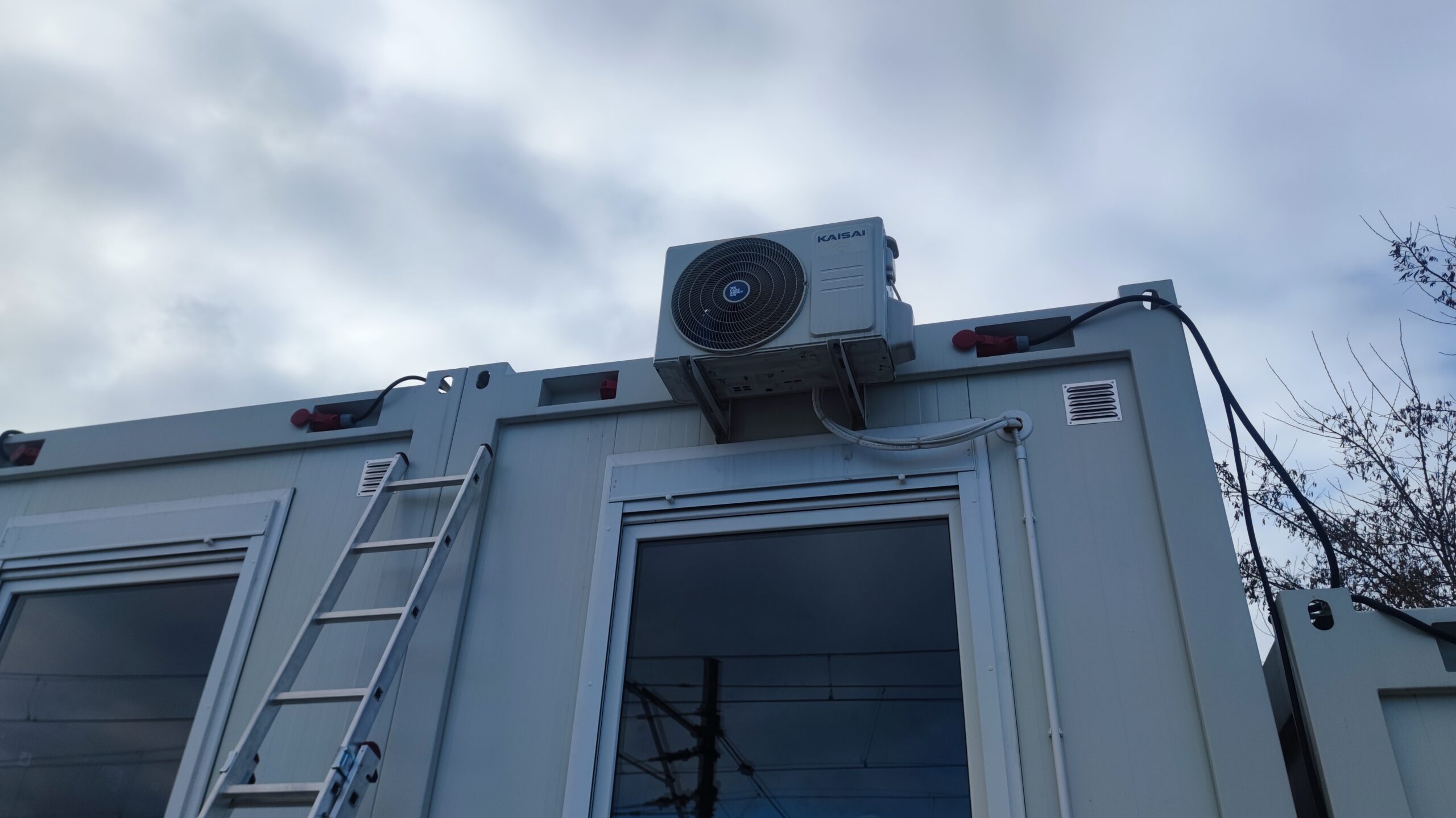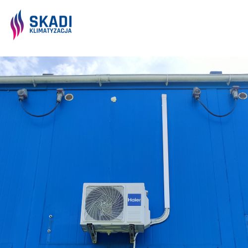 • Rozwiązanie: Dedykowane dla każdego z pomieszczeń. W pierwszym: zdemontowano uszkodzone urządzenie i usunięto starą instalację freonową oraz przewody komunikacyjne, zamontowano nowy klimatyzator Gree Pular PU12S i wymieniono instalację zasilającą wraz z okablowaniem. Ponadto wykonano przyłącze z rozdzielnicy z zabezpieczeniem nadprądowym B10, instalacja o długości ok. 12 metrów. W drugim pomieszczeniu: zamontowano klimatyzator Gree Pular PU12S, wykonano nową instalację freonową oraz komunikacyjną wraz z odprowadzeniem skroplin metodą grawitacyjną na zewnątrz budynku (teren zielony). Ponadto w sąsiadującym kontenerze socjalnym zrealizowano wymianę jednostki na model Haier Revive 3.5, stanowiący funkcjonalny zamiennik wcześniej eksploatowanego urządzenia.